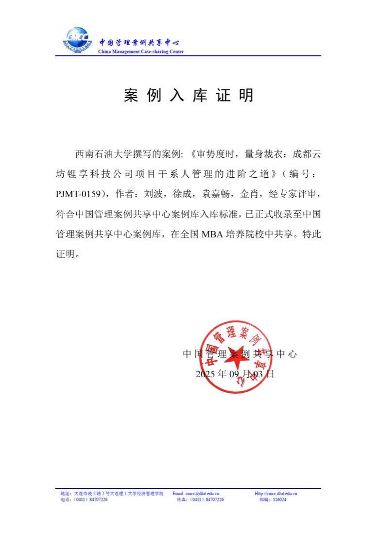 我院刘波教授及其团队撰写的MBA教学案例《审势度时,量身裁衣:成都云坊锂享科技公司项目干系人管理的进阶之道》(案例编号:PJMT-0159)成功入选中国管理案例共享中心(CMCC)案例库,这是我院在管理案例研发与教学应用方面的又一重要成果。