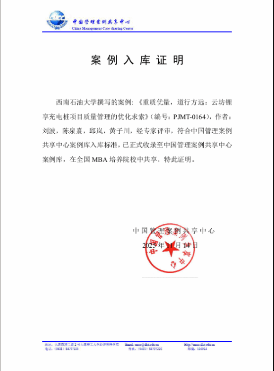 我院刘波教授团队撰写的MBA教学案例《重质优量,道行方远:云坊锂享充电桩项目质量管理的优化求索》(案例编号:PJMT-0164)成功入选中国管理案例共享中心(CMCC)案例库。