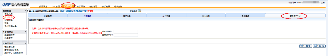 1、学生所选课程与本次组班课程的课程号相同,可以通过直接重修(补修)选课。
