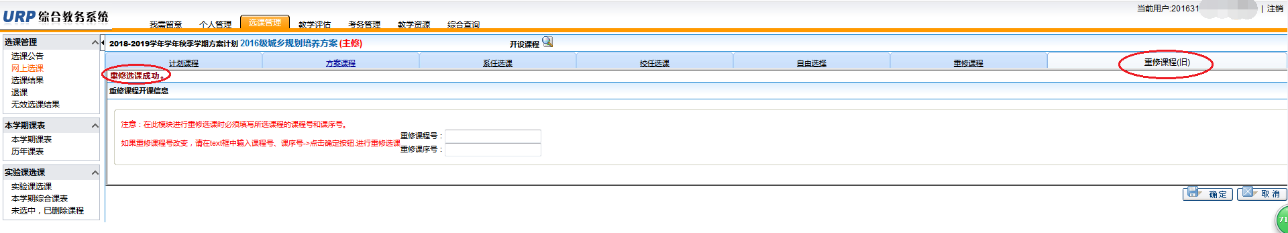 第一步:登录教务系统,依次点击导航条中的【选课管理】→【网上选课】,选择培养方案,然后点击【重修选课(旧)】,进入重修选课页面。