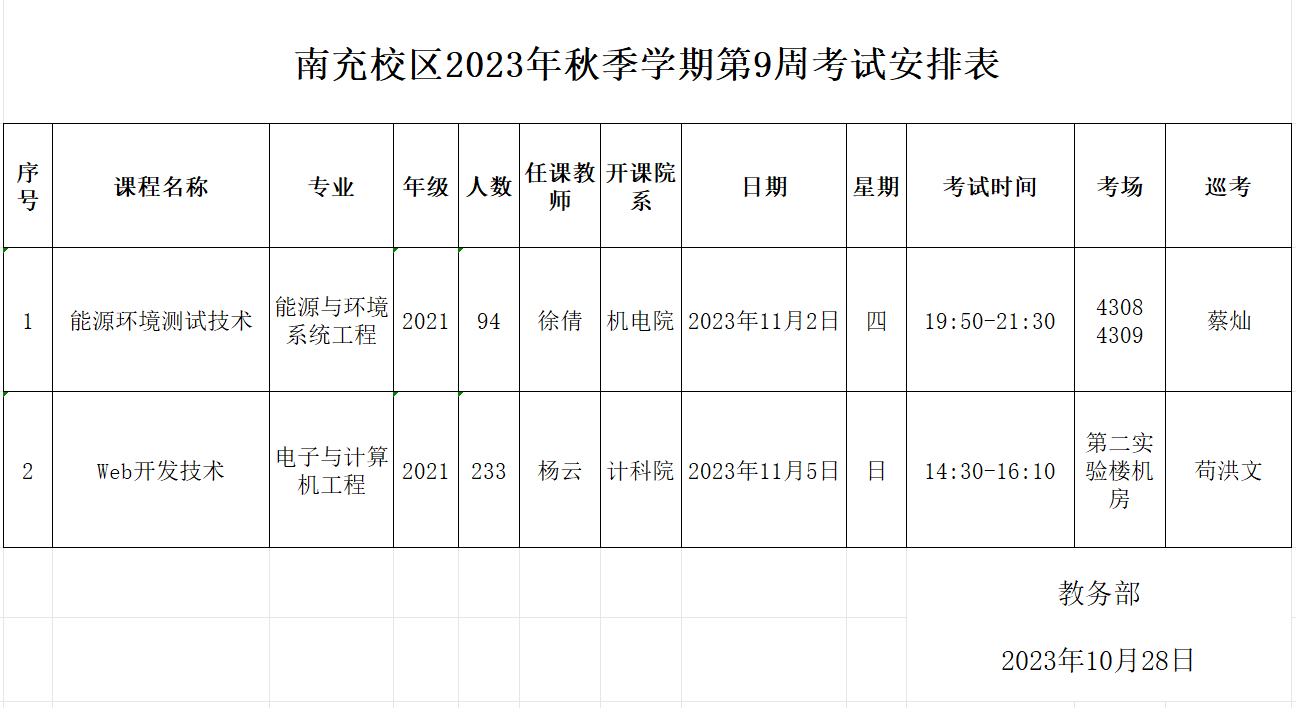 南充校区2023年秋季学期第9周考试安排表