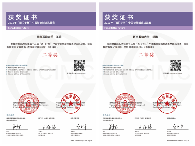 近日,教育部2019年第十三届“西门子杯”中国智能制造挑战赛全国总决赛在辽宁鞍山闭幕。工程学院教师梁春平、周春晓指导机械电子工程2017级学生王荣、杨鹏代表我校首次参赛,荣获数控数字化双胞胎——虚拟调试赛项全国总决赛二等奖。