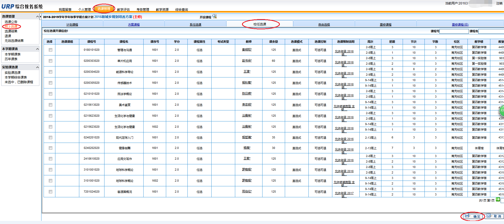 停开课程改选、学生重修选课时间:2019年10月16日12:00~10月17日10:00。