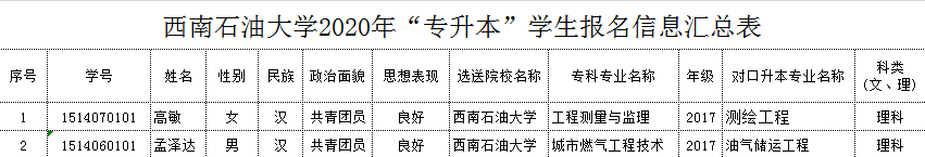 根据《四川省教育厅关于2020年普通高等学校选拔优秀专科毕业生进入本科阶段学习的通知》(川教函〔2020〕243号)和《西南石油大学关于2020年校内选拔应届优秀退役专科毕业生进入本科阶段学习的通知》(教务字〔2020〕55号)文件精神,南充校区组织完成了2020年校内“专升本”报名工作,现对报名参加“专升本”选拔的学生信息进行公示。