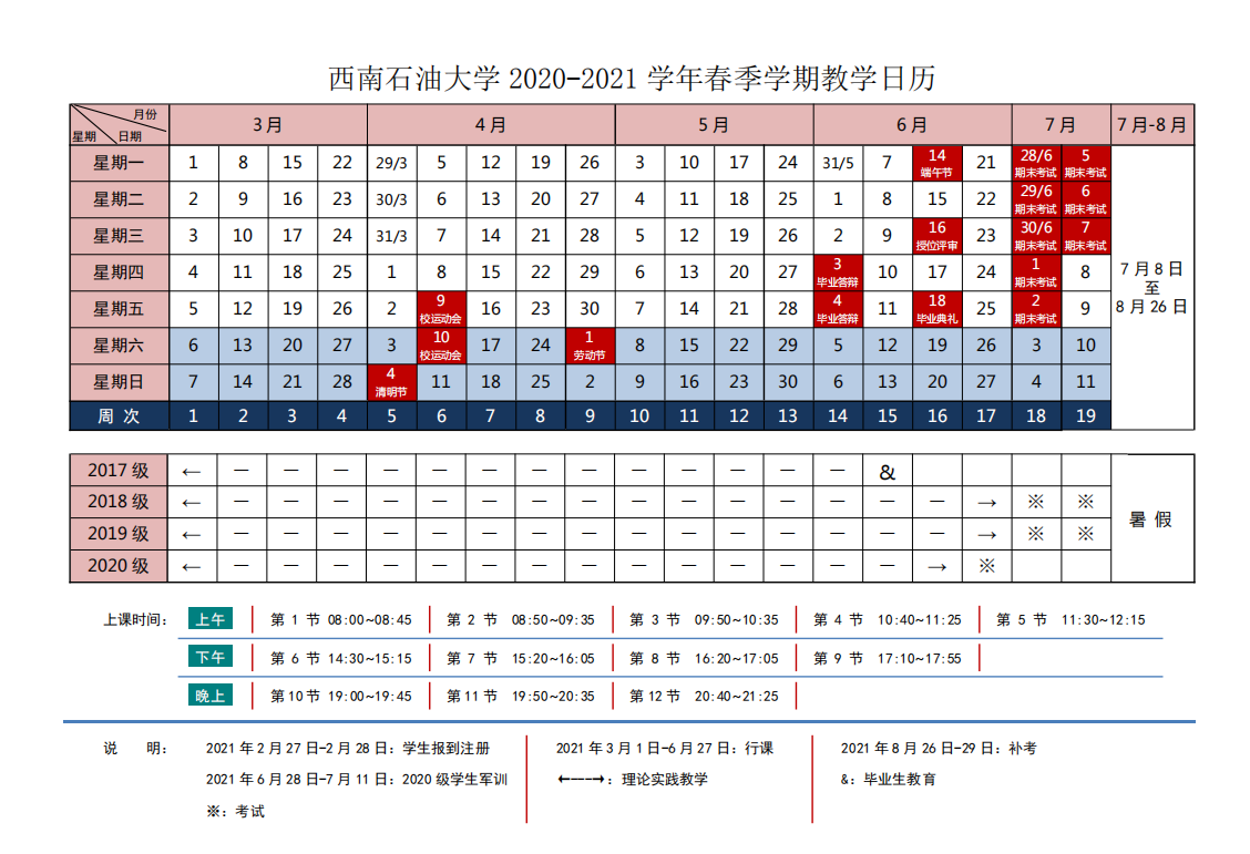 西南石油大学2020-2021学年春季学期教学日历