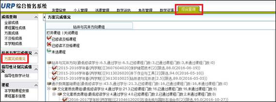 2021届毕业生可登录综合教务系统,点击“综合查询”—“方案完成情况”,查询个人学业完成情况(如下图)。