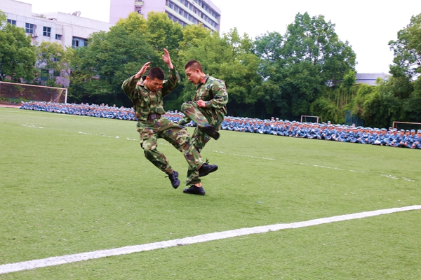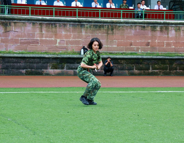 “杀!杀!杀!”的口号响彻足球场,承训部队男教官为大家带来了精彩的擒敌拳表演。教官们个个精神抖擞,眼神里透露着坚毅,整齐的出拳、踢腿凌厉有力,彰显出军人的龙虎声威,表演博得阵阵掌声和喝彩。巾帼不让须眉,女教官个个身手矫健、动作敏捷、招式有力,带来了精彩的匕首操表演,现场喝彩声此起彼伏。