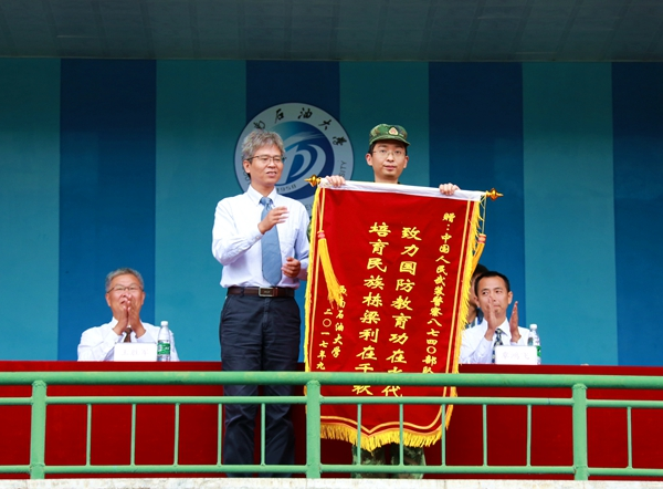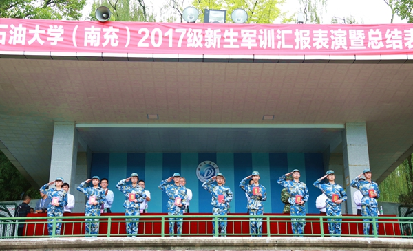 王胜军代表校区军训团对本次军训工作作了总结发言。他说,南充校区2017级全体新生在教官和老师的指导、带领下,严格要求,科学施训,发扬不怕苦、不怕累的中国军人优良作风,团结协作、克服困难,工作扎实,按计划,安全、顺利地进行了军事训练,圆满完成了军训课程设计要求,达到了预期目标,成效显著。希望同学们在今后的学习与生活中,发扬军训期间顽强拼搏和遵章守纪的优良作风,把军训养成的良好生活习惯长期保持下去,秉承“为祖国加油、为民族争气”的西南石大精神,努力学习,立志成才,报效祖国!