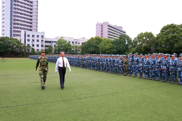 伴随着庄严的国歌声,国旗队护送鲜艳的五星红旗缓缓入场。王胜军在任果少校的陪同下检阅了新生军训方阵。参训同学士气高昂、神采飞扬、英姿飒爽。“同学们好!”、“同学们辛苦了!”表达了王胜军对参训同学的亲切问候。“刻苦学习,为学校争光”彰显着学子们的豪情壮志。