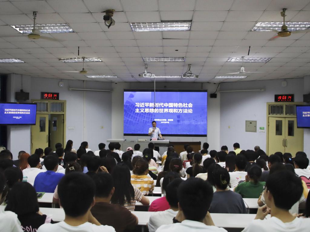 张晓明以《习近平新时代中国特色社会主义思想的世界观和方法论》为题,介绍了开展学习贯彻习近平新时代中国特色社会主义思想主题教育的重大意义,并从道理、学理、哲理、原理四个纬度阐述了对习近平新时代中国特色社会主义思想的世界观和方法论的理解认识。他说,习近平新时代中国特色社会主义思想的世界观和方法论是辩证唯物主义和历史唯物主义在中国特色社会主义新时代的创新发展。青年学生是中国特色社会主义的建设者和接班人,承载着中华民族伟大复兴的历史使命,务必要把握好习近平新时代中国特色社会主义思想的世界观和方法论的精髓,坚持好、运用好贯穿其中的立场、观点、方法,努力做到内化于心,外化于行。