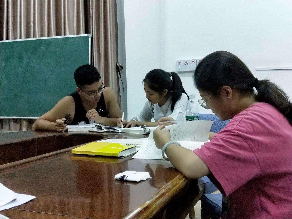 “这道题让我再给你讲一种解题思路……”晚上8点多的外语村就业宣讲室依旧灯火通明,屋里两三个同学一组分别在不同的地方认真学习,演算习题,讲解不同的解题思路。