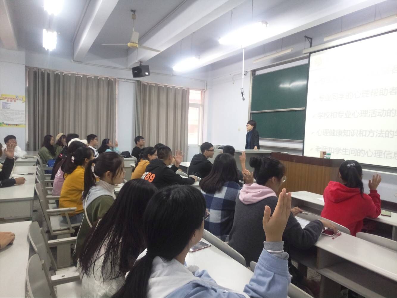 下午4点半,2018级各专业心理委员在4205教室参加了第二批次心理委员培训:如何做一名合格的观察者。首先,吴静老师欢迎各位新同学加入心理委员这个大家庭,从对心理委员的角色、职责、定位三个方面进行阐述,让各位心理委员感受到了自己肩上的责任和义务,明确了今后工作的方向,肯定了心理委员在班级建设中的重要作用。其次,吴老师分享了关于大学生的心理健康知识,尤其是对于可能处于危机当中的同学的识别和帮助,进一步丰富了心理委员们的心理知识,有助于他们日常工作的开展。最后,吴老师对2018级心理委员及班导生进开展了一次以积极融入大家庭为主体的团体辅导,通过“大风吹”、“五毛一块”、“棒打薄情郎”、“心有千千结”等活动使同学们进一步地认识自我、了解彼此,增强了心理委员群体的凝聚力,也为他们提供了一个展示自己的平台。培训过程中,同学们团结协作,在轻松快乐的氛围中加深了彼此之间的了解,感受到了团体的温暖,学会了在集体生活中相互支持、相互理解、相互信任。活动中,吴老师向同学们介绍了各个活动需要准备的物品、在做每个活动时的注意事项以及如何分享团体成员感悟的方法。