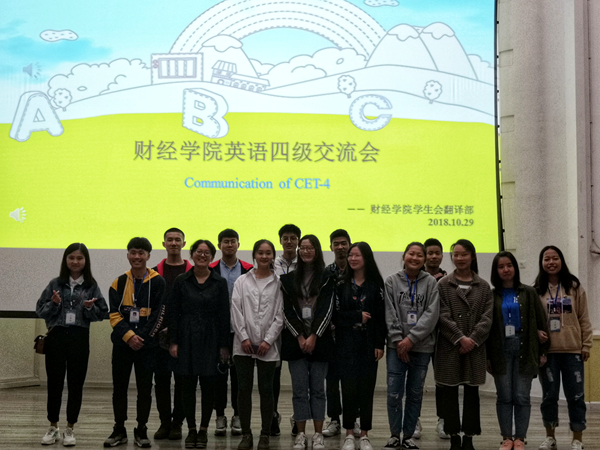 10月29日晚,财经学院在多功能学术报告厅举办了四级考试经验交流会,交流会特别邀请了去年四级考试中优秀代表曾雨溪、刘慧、陈志宇作为主讲嘉宾,财经学院2018级全体同学参加了此次交流会。