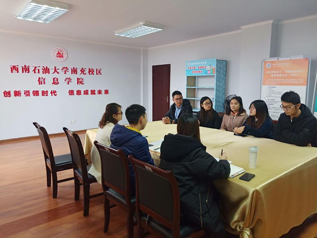 为充分发挥朋辈帮扶作用,帮助学业困难学生,11月18日,信息学院成立了朋辈发展中心,在完井楼301办公室举行了朋辈发展中心学生骨干首次招新面试会。信息学院辅导员胡丹、刘强,信息学院学生会主席赖希担任面试官。