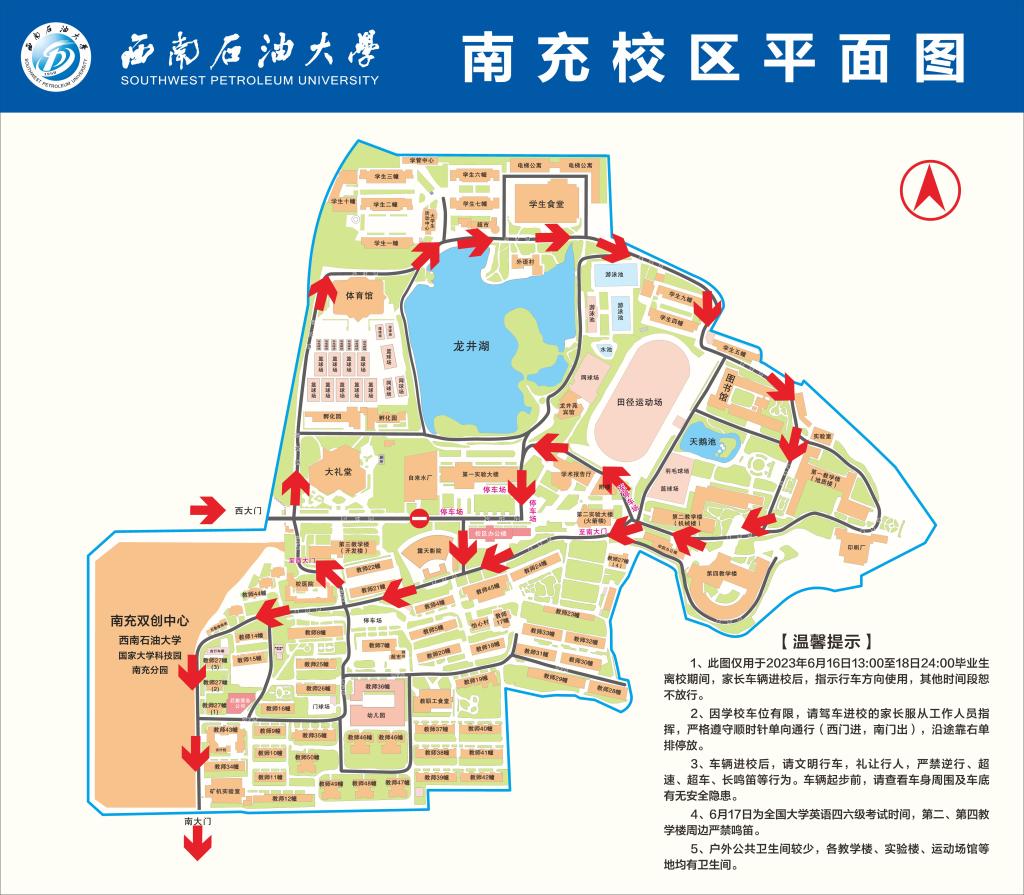 车辆入校后,实行顺时针环线单向通行,具体线路为:由西大门进入,左转前往学生宿舍方向,依次途径体育馆、学生食堂、学生四号楼、第一教学楼、第四教学楼、露天剧场、教工区道闸,最后由南大门出校。