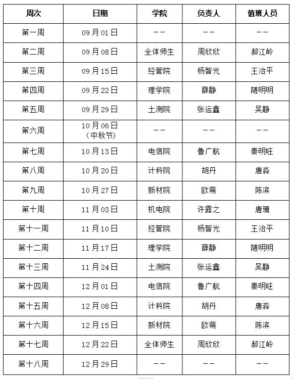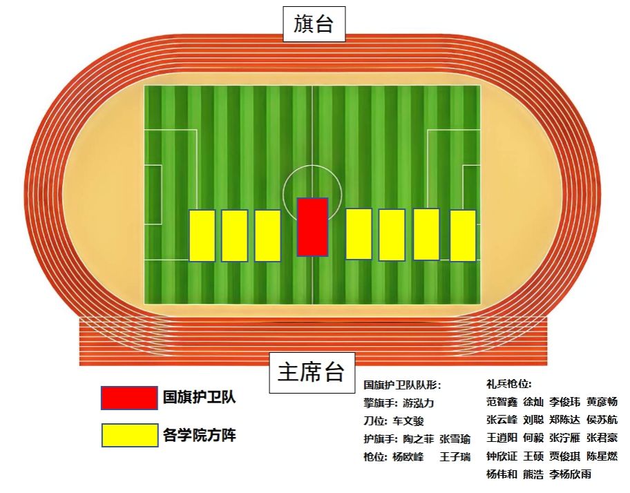 一、请本周参加升旗仪式的学院必须于早上6:50前在足球场整队集合完毕(面向主席台),升旗仪式于7:00准时开始,不得延误。