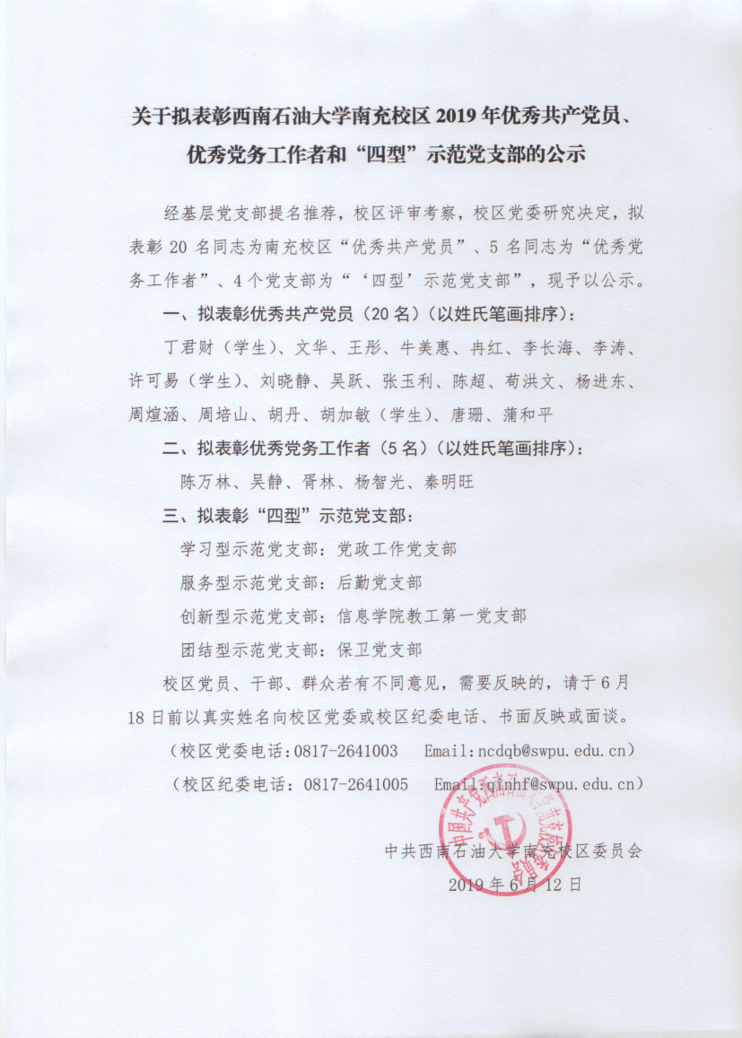 关于拟表彰西南石油大学南充校区2019年优秀共产党员、优秀党务工作者和“四型”示范党支部的公示