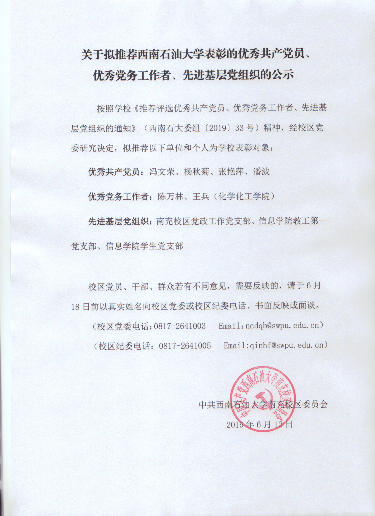 关于拟推荐西南石油大学表彰的优秀共产党员、优秀党务工作者、先进基层党组织的公示