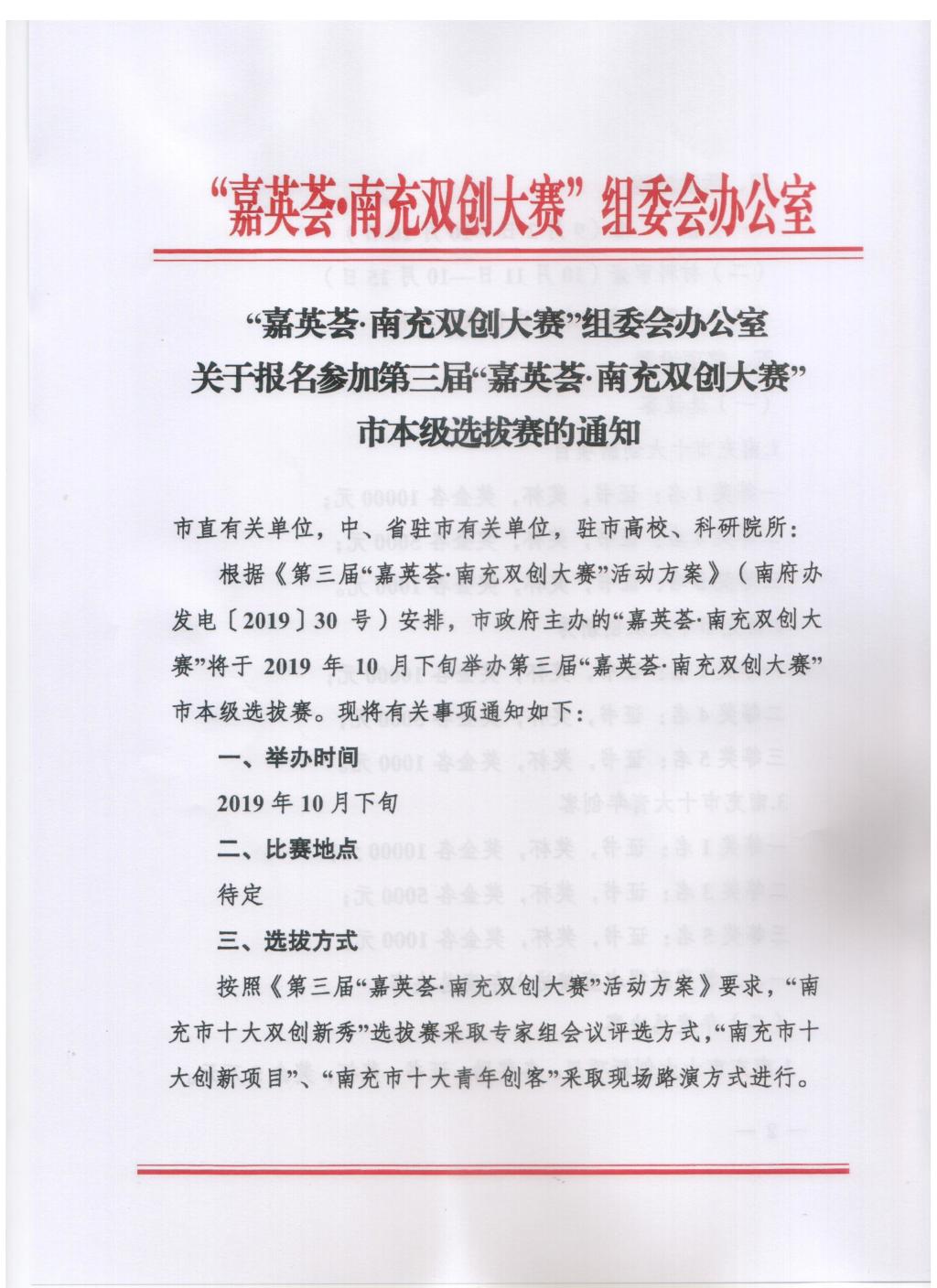 “嘉英荟·南充双创大赛”组委会办公室关于报名参加第三届“嘉英荟·南充双创大赛”市本级选拔赛的通知