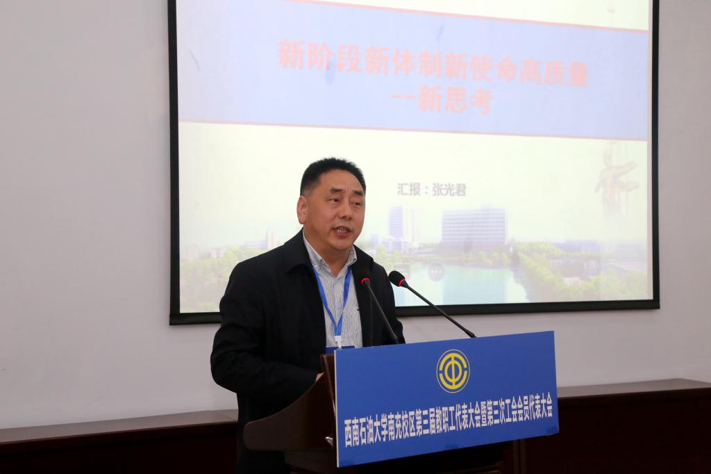 张光君致闭幕辞。他指出,本次会议是南充校区处在新旧管理体制机制过渡期、内涵建设起势期、“三大战役”关键期召开的一次重要会议。会议总结过去、展望未来,意义重大,充分彰显了南充校区民主管理和依法治校的生机活力。校区工会在校区党委行政和学校工会的领导下,充分发挥全体代表参与校区民主管理、民主监督的积极性、主动性和创造性,工作开展有力、成效显著,受到了校区教职工的高度评价,切实增强了教职工的获得感和幸福感。