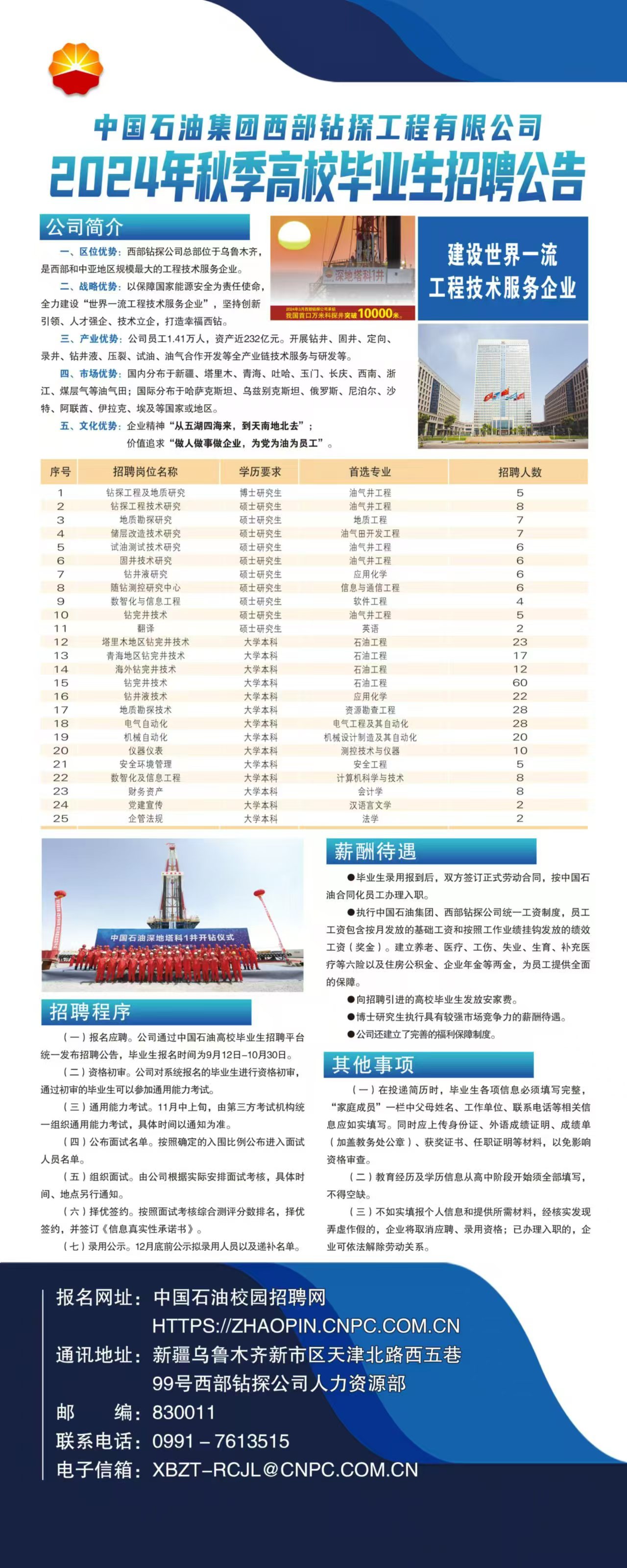 中国石油集团西部钻探工程公司校园招聘(9月21日)