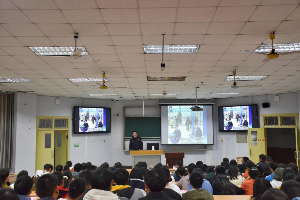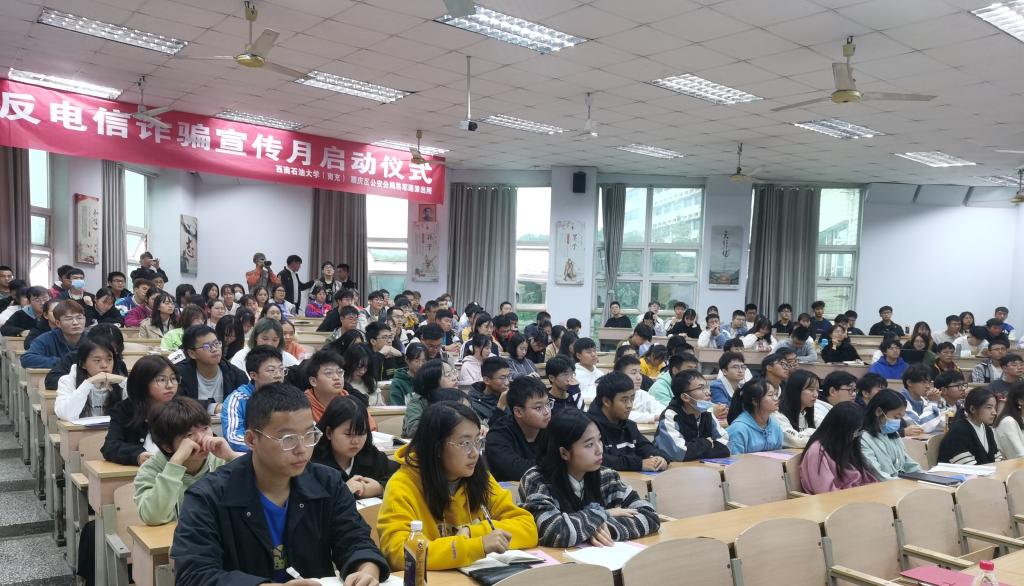 10月28日下午,保卫部联合信息学院在第四教学楼4416教室举办反电信诈骗宣讲活动。南充市公安局顺庆区分局将军路派出所所长苑石琦应邀担任主讲人。信息学院团总支副书记兼学生工作办公室副主任胡丹,保卫部治安科有关同志和信息学院辅导员鲁广航、温霞、石国勇及学院200余名学生参加了此次活动。