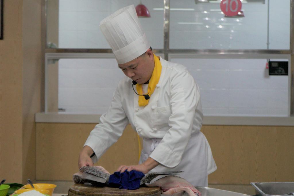 松鼠鱼是谢老师的拿手菜。制作松鼠鱼时,谢老师先用刀贴着鱼脊划到尾,鱼骨便轻松剥离,然后飞刀横下,便在在鱼肚肉上勾勒出精细的花纹,随后用手一搓,鱼肉便有了松鼠的形状。谢君宪拿起另一条鱼处理了一部分,又将鱼肉分成了几块分发给几位想要尝试处理鱼肉的同学。同学们不熟练地拿起菜刀,小心翼翼地将鱼肉进行进一步的处理。谢老师告诉同学们处理鱼肉的技巧:刀柄要握在掌心中间,左手扶着鱼肉,力度不要过大。在谢君宪的悉心指导下,几位同学顺利完成了鱼肉处理环节。处理好鱼后,谢老师起锅烧油、关火、用油煎鱼、淋汁摆盘,动作干净利落,毫不含糊。酥黄鱼肉搭配上鲜红酱汁看起来让人垂涎欲滴,同学们迫不及待地拿出筷子品尝,赞不绝口。