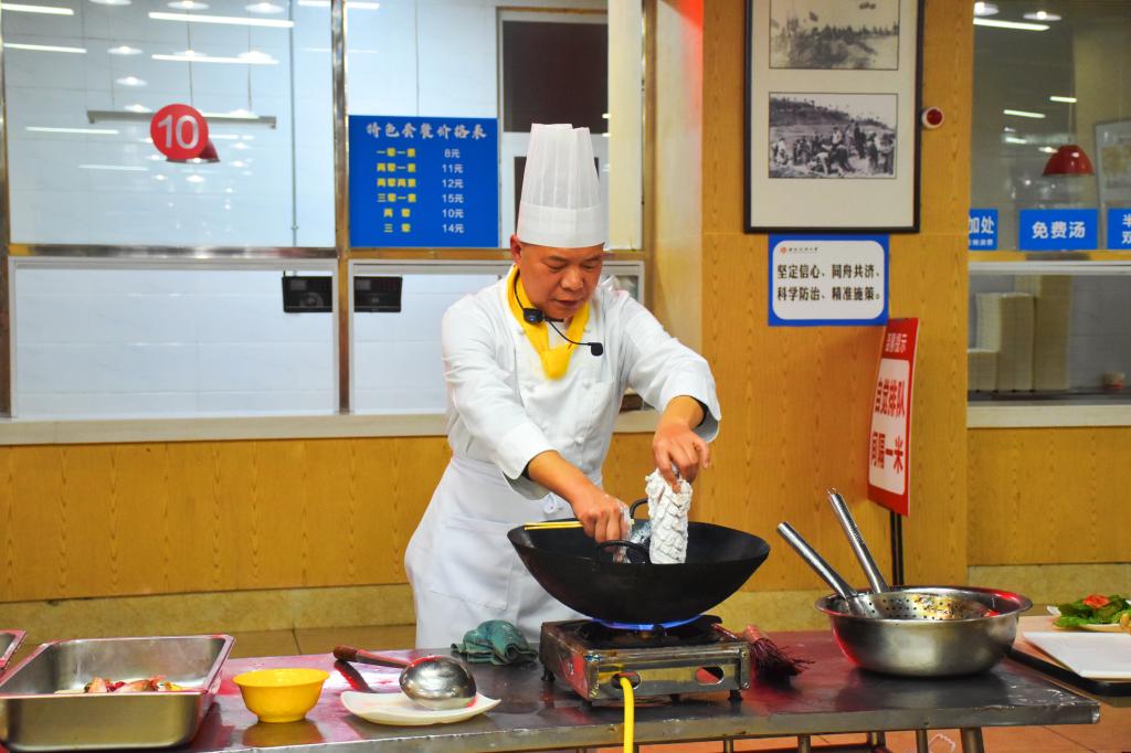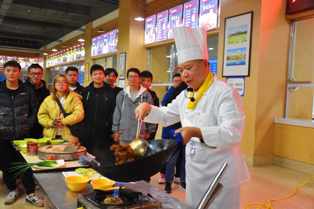 在学生食堂,谢君宪老师现场烹饪了西柚烤牛肉、麻婆豆腐、松鼠鱼、茄汁葡萄鱼、龙井鱼米5道菜肴,讲述了菜肴背后的故事。同学们认真听讲,对谢老师的高超厨艺啧啧称赞,纷纷拿出手机拍照留影,现场气氛热烈。