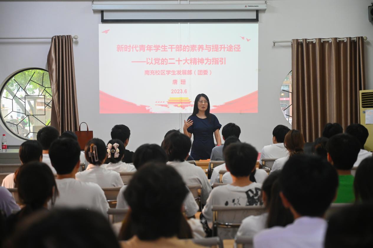 6月9日晚,南充校区学生发展部(团委)副部长唐珊讲授了学习贯彻习近平新时代中国特色社会主义思想主题教育专题党课。此次党课主题为《新时代青年学生干部的素养与提升——以党的二十大精神为指引》。南充校区80余名团学骨干聆听了党课。