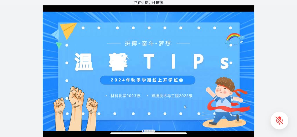 为做好2024年秋季学期开学后的学生管理工作,引导学生树立新学期的奋斗目标,尽快适应新学期的学习生活,8月25日下午新材院各年级辅导员组通过线上会议开展2024年秋季学期“开学第一课”活动。