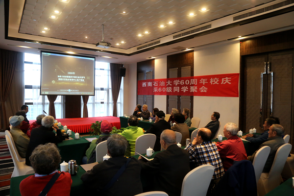 采油60级校友观看学校宣传片,了解学校的建设发展