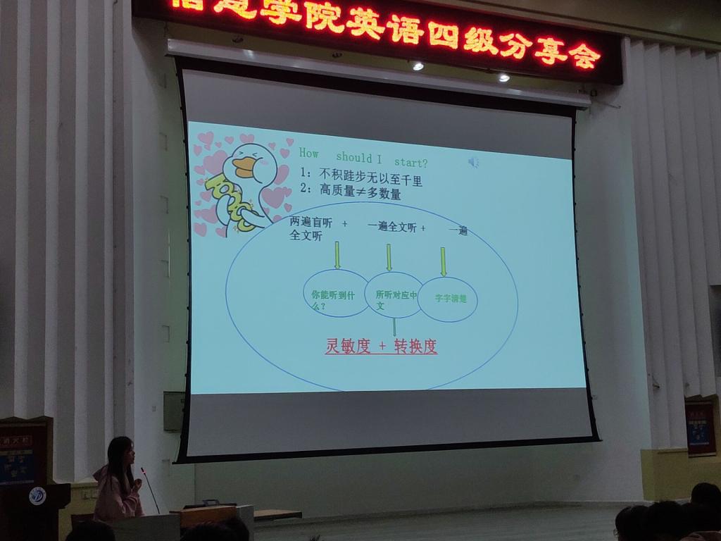学长学姐向2018级同学介绍了大学生英语四级考试和高中英语考试的异同点,并以不同的四级考试题为例为大家进行讲解,讲解了各种题型的重点、做题技巧,分享了自己学习大学英语、备考四级的经验,推荐了学习英语的APP,还分享了自己英语四级考试时发生的趣事。