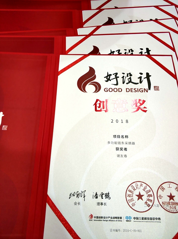 南充校区学生罗豪、吉克拉一、陈馨、杨吉鑫、赵博伟在潘波、谢友春老师的悉心指导下,历时近2年,不断改进设计作品,最终设计完成的作品“多功能链条采摘器”喜获2018度中国创新设计 “好设计创意奖”。2018 “好设计创意奖”为我校首次获得,实现了我校角逐“好设计奖”历史性的突破,充分展现了南充校区积极开展“新工科”教学实践取得的成效。