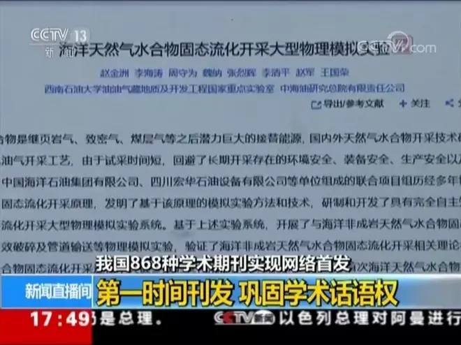早在10月27日,央视新闻直播间在“我国868种学术期刊实现网络首发 第一时间刊发 巩固学术话语权”这则新闻中,以我校学术论文《海洋天然气水合物固态流化开采大型物理模拟实验》和模拟实验的视频为事例,说明学术论文网络首发的优越性。