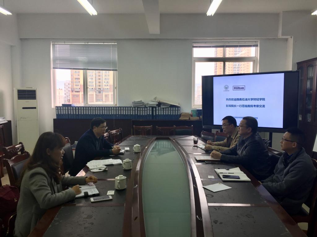 3月18日下午,彭双、李汶静、张艳萍一行前往四川旅游学院酒店管理学院学习调研。酒店管理学院院长袁新宇、副院长李智和院长助理宗平等分享了四川旅游学院学院在酒店管理专业人才培训方案修订、人才培养模式改革、教材建设、校企合作办学、实习管理、实验室建设等方面的经验。