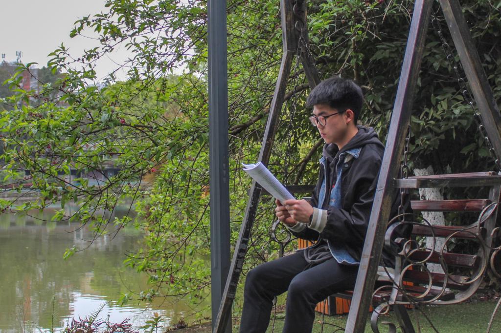 清早,微风吹拂着龙井湖,泛起阵阵涟漪,淡淡的青草香沁人心脾。龙井湖畔,情人岛上,电子与计算机工程2018级的郭航宇同学正在专心致致地诵读英语。他认为,青年学子要珍惜时间,把握学习机会,积极参加学科竞赛和社会志愿服务,不断提高自身综合素质。他说,吃得苦中苦,方为人上人。在别人看来,他每天都很辛苦,可他却感觉每天都很充实,相信大学毕业时自己能够实现梦想。