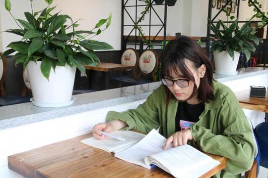 教学餐厅里,走廊隔断上摆放的白掌郁郁葱葱,信息管理与信息系统2018级的李丹同学在为即将迎来的线性代数测验做准备。当图书馆没有自习座位时,她往往会选择环境优美的教学餐厅作为自习室。她说,窗外的绿叶让她感觉到希望、活力,让她心情舒畅。