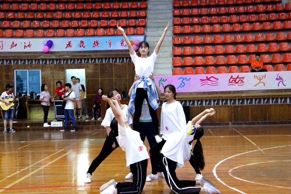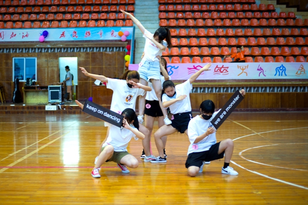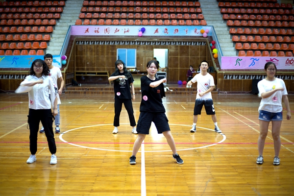 校区健身街舞队现场表演了参加2019年全国健身操舞四川分站赛暨四川省健美操公开赛的舞蹈,博得了现场观众阵阵掌声。表演结束后,参加汇报考核的学生通过自由组队的形式(每队4-8人),两队分A、B场地同时进行比赛。他们身着精心挑选的队服,合着音乐的节拍,动作流畅自如,展现了朝气与活力。