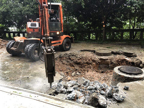 近日,后勤服务公司接到师生反映,第四教学楼背后路面出现凹陷的现象,不但对过往行人及车辆造成了不便,而且存在安全隐患。对此,后勤公司能源维修服务中心计划对该处进行维修。经过实地勘察后发现,需对该地重新进行开挖,再浇筑混凝土。