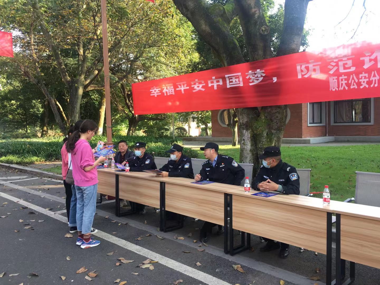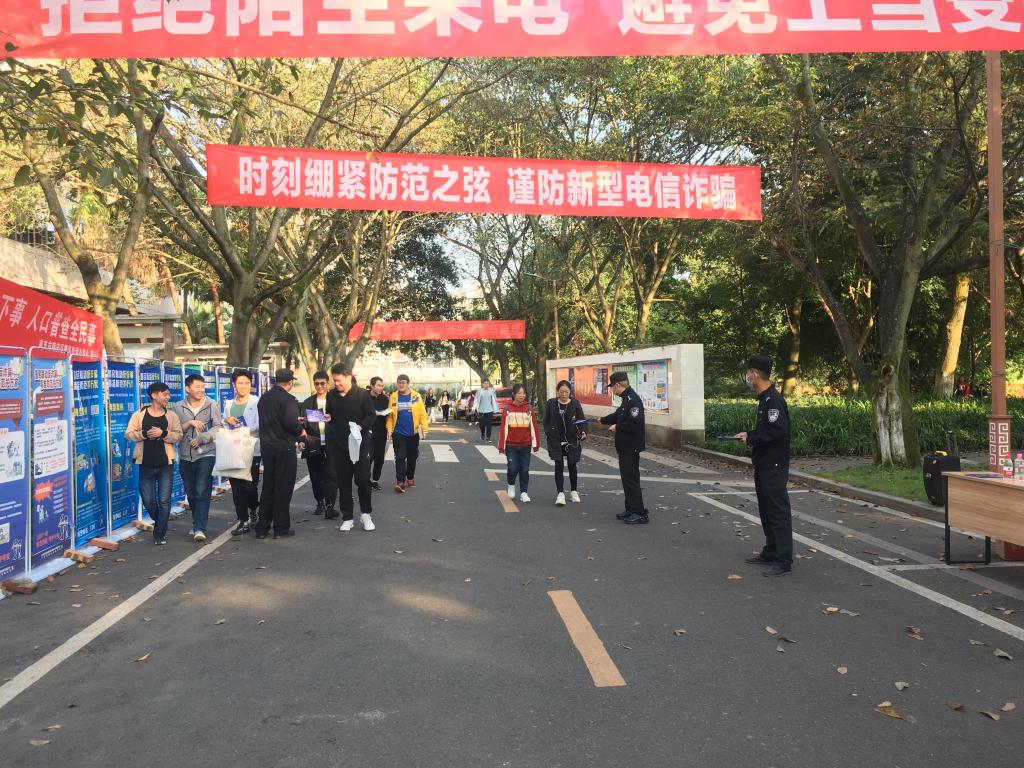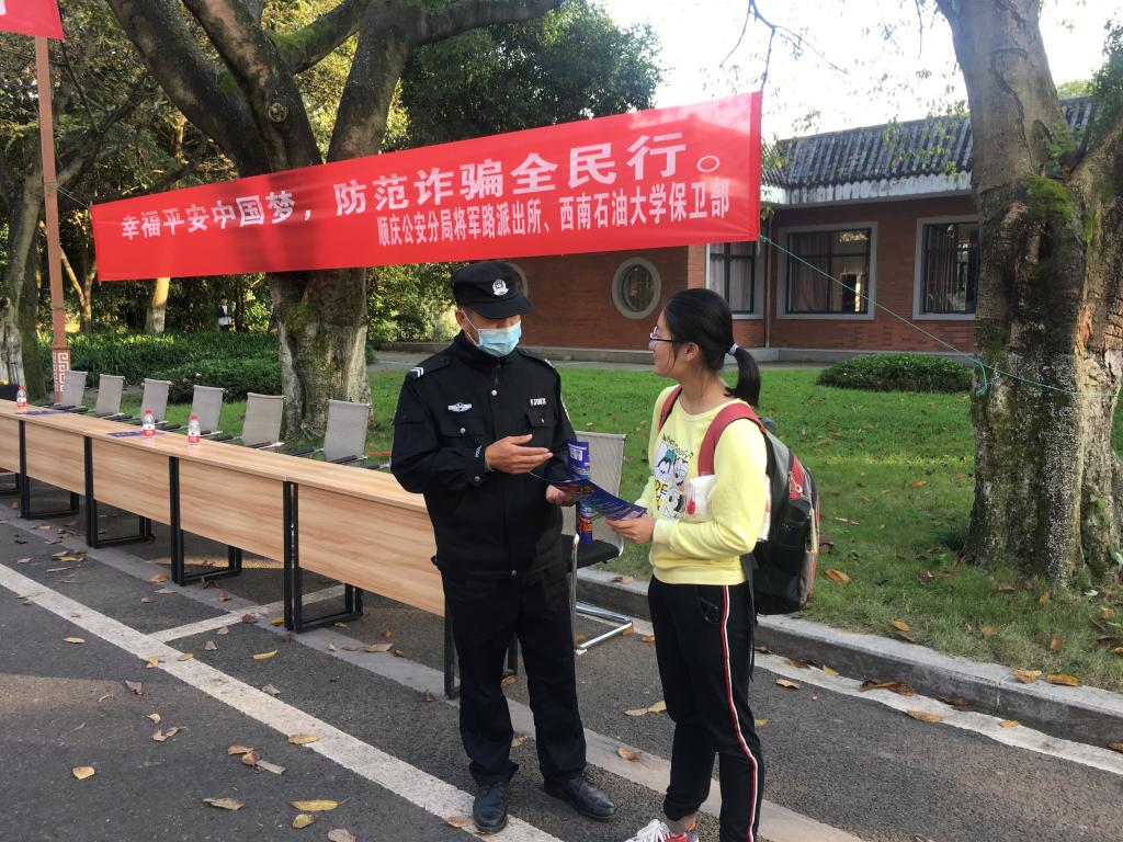 11月6日下午,保卫部联合顺庆公安分局将军路派出所在南充校区开展了“反电信诈骗”宣传教育活动。保卫部治安科科长蒲和平,顺庆将军路派出所派出所副所长贾晓明参加了本次活动。