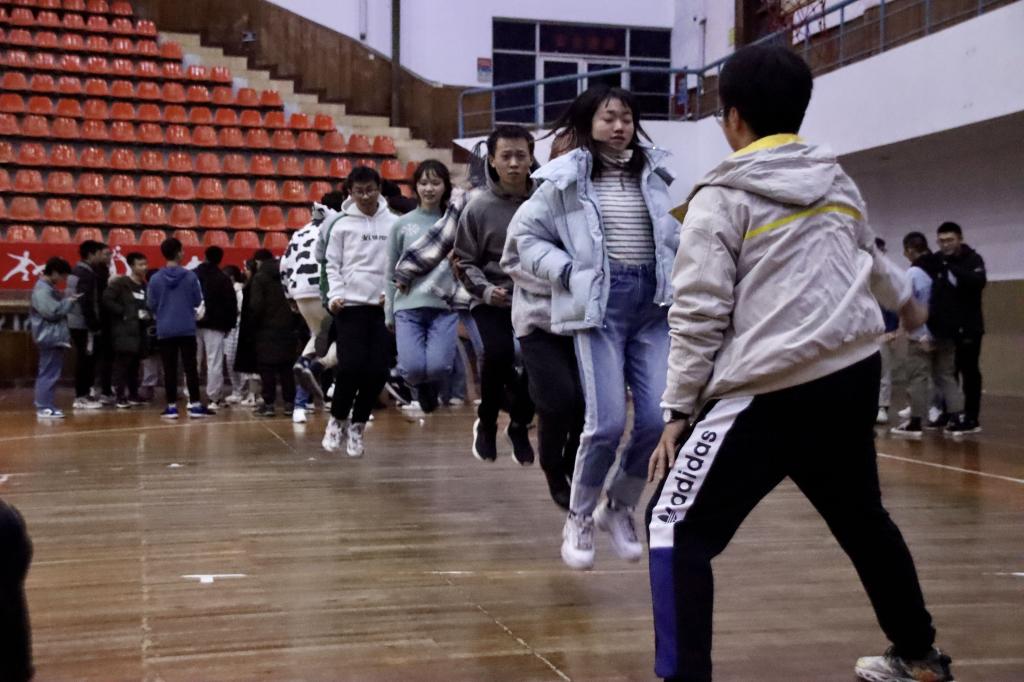 比赛开始前,各专业同学在规定范围内有序排开,抓紧一分一秒进行热身运动。参赛选手们紧绷肌肉、严阵以待,在不断的尝试中,找寻适合本团队的节奏。