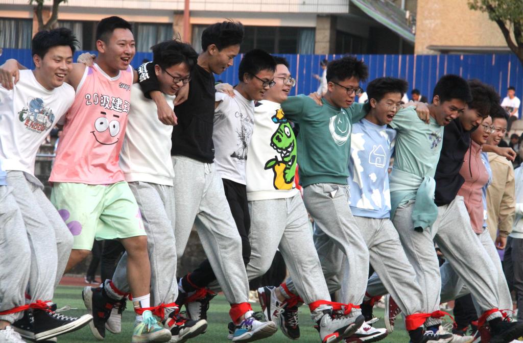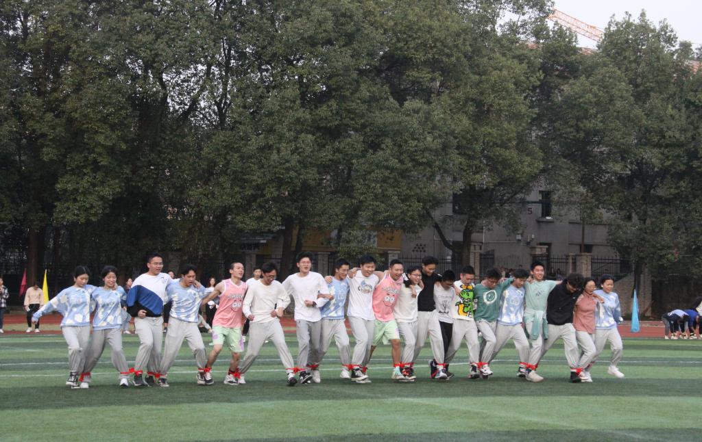 比赛开始前,同学们热情高涨。参赛人员做好准备活动,与队友们互相打气,商量比赛策略。比赛进行时,同学们奋勇前进。20名队员手挽手,脚绑脚站在起跑线上蓄势待发,号令一响,大家步调一致,口号整齐,一步一步向前进。场外,观众加油呐喊声此起彼伏,迅速点燃比赛气氛。同学们相互帮助,相互扶持,有的队伍尽管出现了小失误,也毫不气馁,扶起摔倒的队员,迅速找回状态后,奋起直追,争分夺秒,最终成功到达终点。