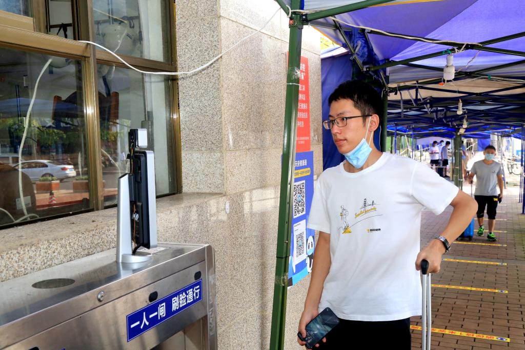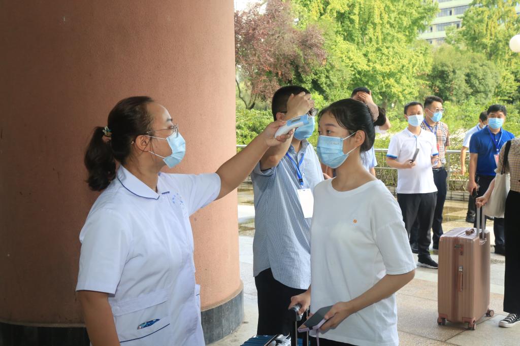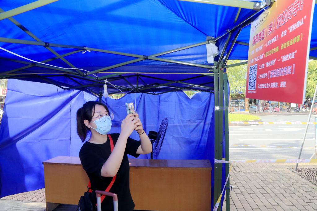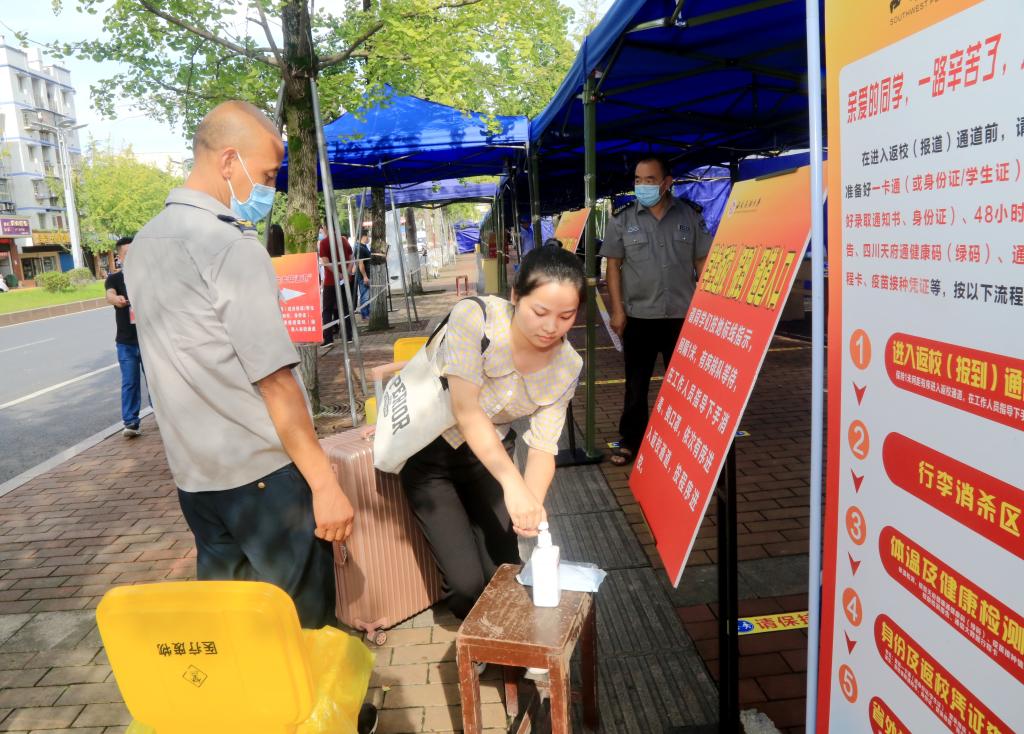 参加演练的学生从西大门入校通道进入,保卫部核查校园一卡通(或学生证、身份证);校医院组织返校学生进行体温检测,并核验返校学生是否有48小时内核酸检测阴性证明、四川天府健康通绿码,了解返校学生疫苗接种情况,进行健康状况问询;学生工作部(团委)核查学生“准返校凭证”、核验“学生通信行程卡”。筛查合格后,学生按规定进入校内。在出现返校学生体温测量异常的情况后,保卫部立刻关闭通道,校医院将体温异常学生带到临时隔离点进行复测登记,后勤服务公司对通道进行清洁消毒,校医院结合复测情况对学生采取隔离观察、转诊转运等相应措施。