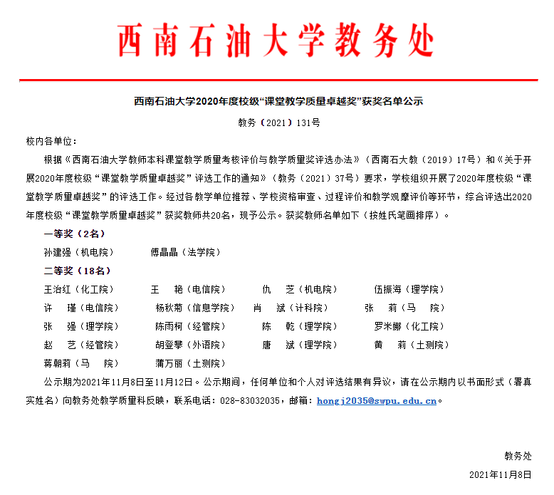 近日,学校举行2020年度“课堂教学质量卓越奖”教学观摩评价活动,26名来自各学院的教师登上讲台,展示课堂教学风采。信息学院杨秋菊老师荣获西南石油大学2020年度校级“课堂教学质量卓越奖”二等奖。本次评选出2020年度校级“课堂教学质量卓越奖”获奖教师共20名。