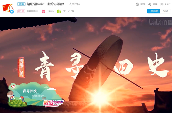 为传播志愿文化,弘扬时代新风,12月5日,由共青团中央举办的2021年“12.5”国际志愿者日主题网络嘉年华在各大网络平台直播进行。南充校区团委原创新媒体作品《青寻四史》作为第一章第二个节目播出。