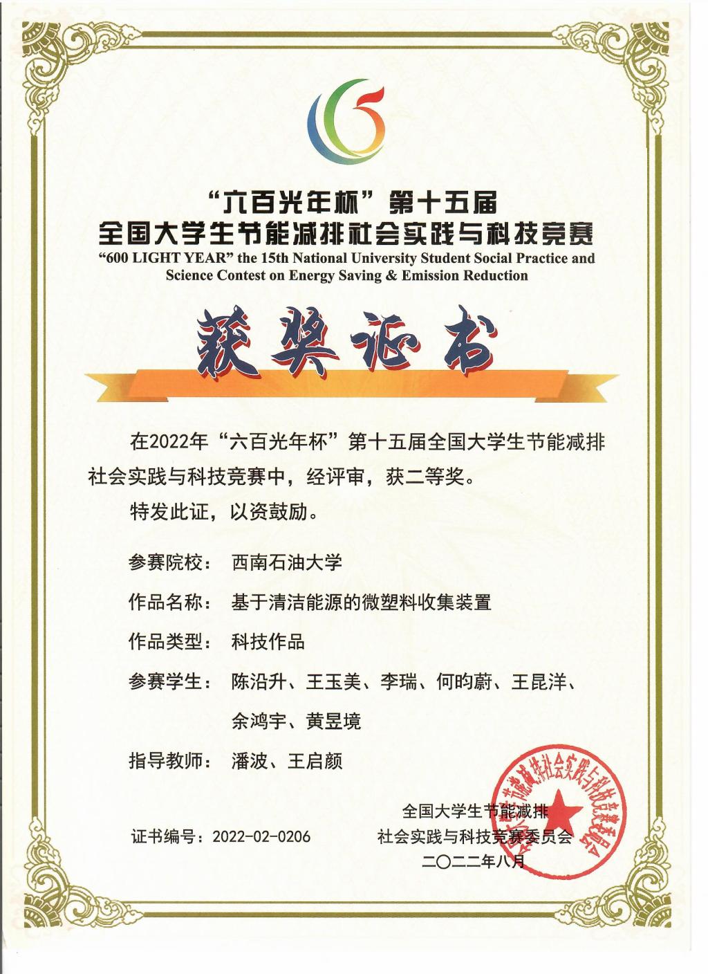 参赛作品《基于清洁能源的微塑料收集装置》荣获科技作品类全国二等奖