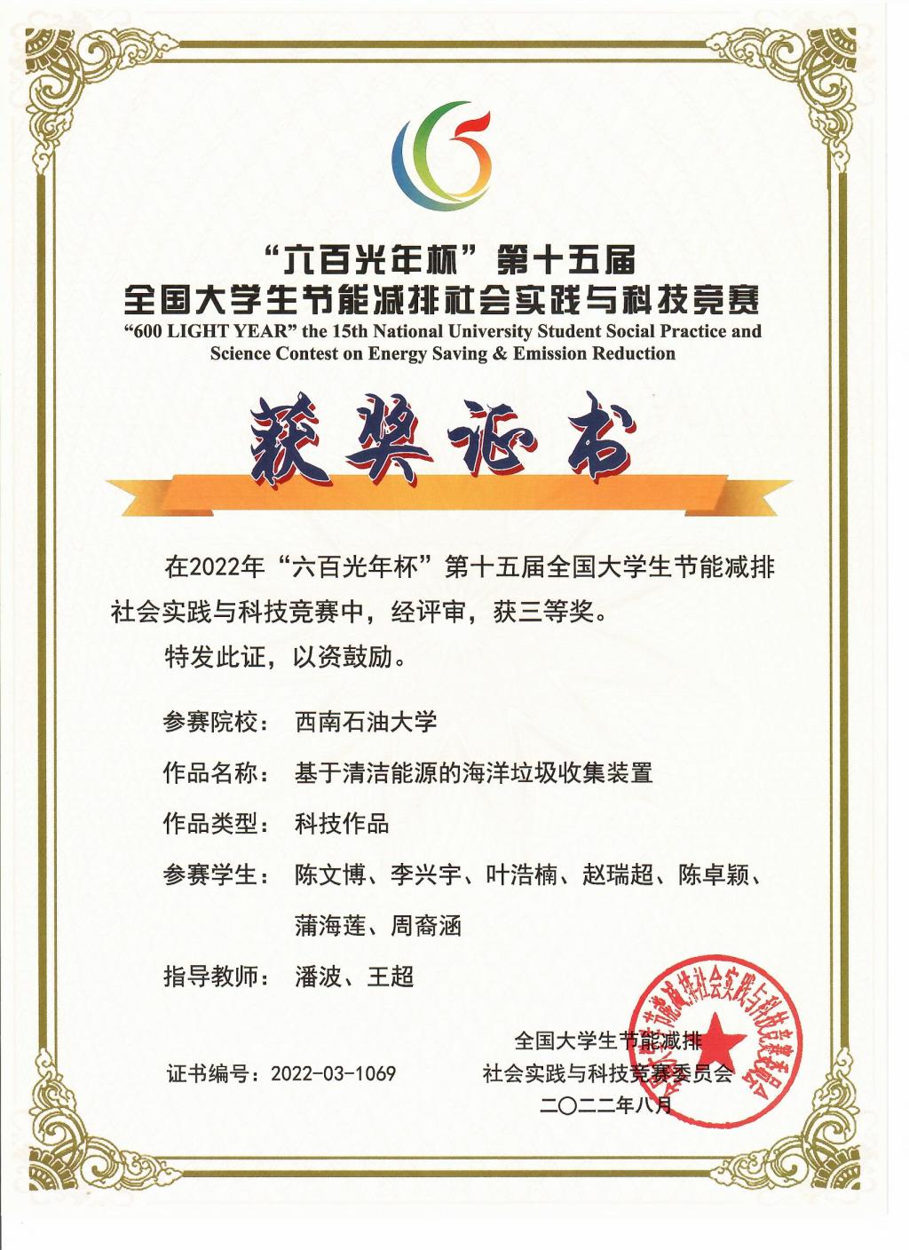 参赛作品《基于清洁能源的海洋垃圾收集装置》荣获科技作品类全国三等奖