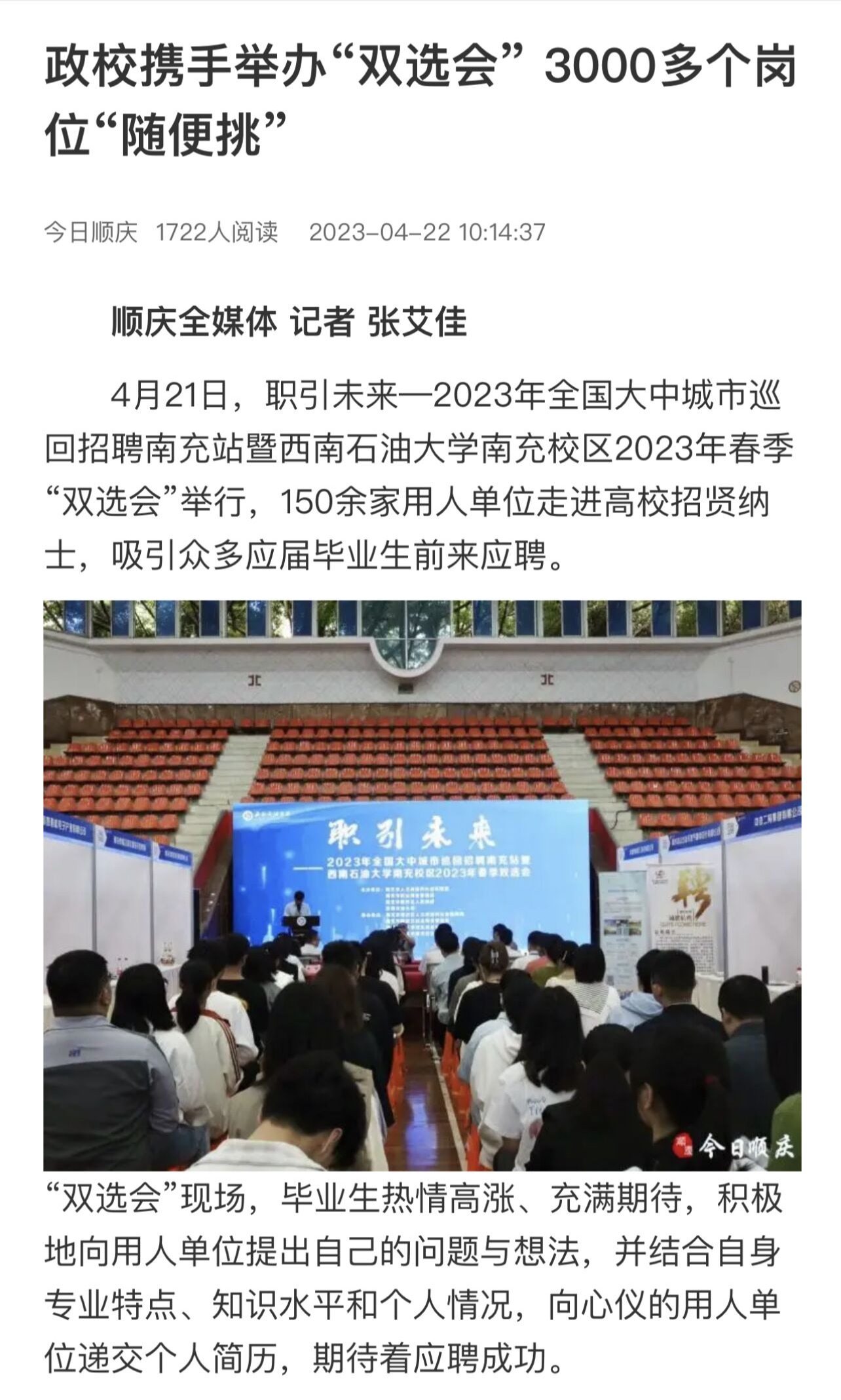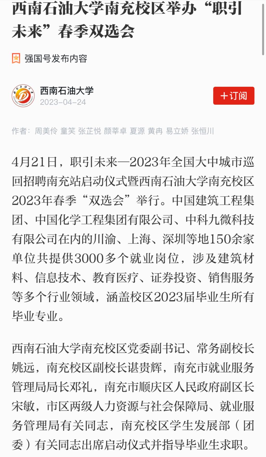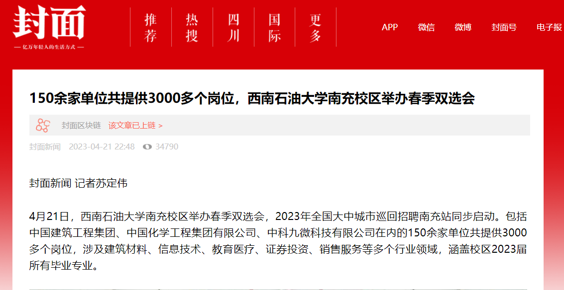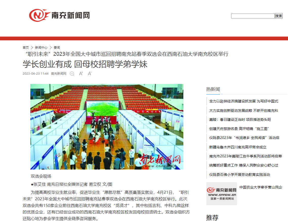 南充日报以《学长创业有成回母校招聘学弟学妹》为题开展了相关报道。学习强国APP以《西南石油大学南充校区举办“职引未来”春季双选会》为题开展了相关报道。封面新闻以《150余家单位共提供3000多个岗位,西南石油大学南充校区举办春季双选会》为题开展了相关报道。今日顺庆以《政校携手举办“双选会”3000多个岗位“随便挑”》为题开展了相关报道。