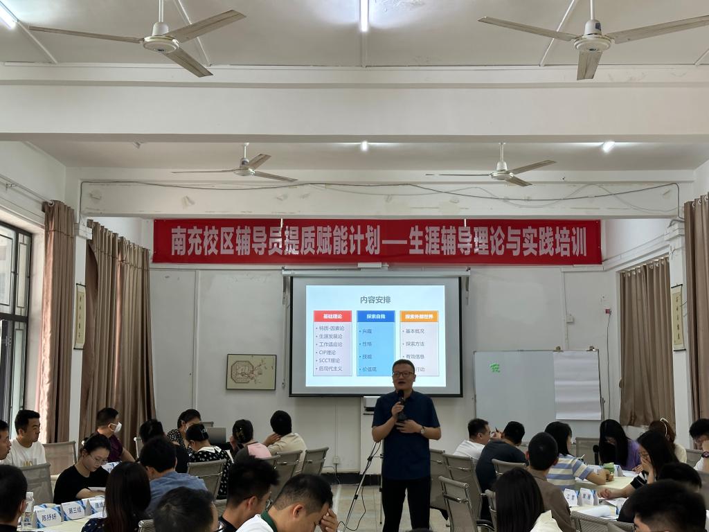 为充分发挥生涯教育的引导作用,与学生全面健康成长形成协同效应,按照“学思想、强党性、重实践、建新功”总要求,聚焦校区辅导员就业指导能力提升,切实将主题教育学习成效转化为提升校区辅导员就业指导能力,5月19日至21日,南充校区举办了辅导员提质赋能计划之“生涯辅导理论与实践”培训。此次培训邀请生涯领域资深培训专家、教育部特聘讲师贾杰担任主讲教师,南充校区党委副书记、常务副校长姚远,南充校区学生发展部(团委)部长郝江岭、副部长唐珊和各学院辅导员参加了培训。