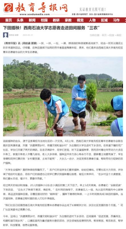《教育导报》讯(周煊涵 谢娜)一探、一扶、一扯、一涮,绿油油的秧苗被熟练地拔下,经由一双双沾满泥土的手传递到田边。仔细看,在秧田里挥汗如雨的劳作者面庞稚嫩年轻,原来,他们是来自西南石油大学南充校区青年志愿者协会的大学生志愿者。